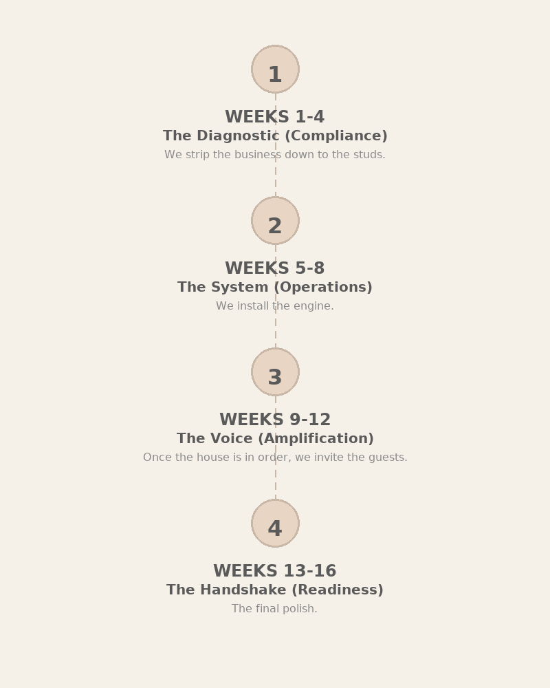 Our 16-week roadmap is a rapid-deployment system designed to close the gap between where your business is (The Hustle) and where the market needs it to be (The Legacy).
